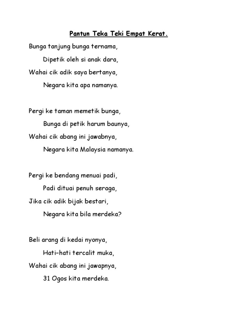 Bisa untuk memperkenalkan diri di kelas, kelompok, guru, atau perkenalan. Pantun penutup acara / majlis. Lampiran pantun 2,4,6,8 keratpantun melayu tradisional.